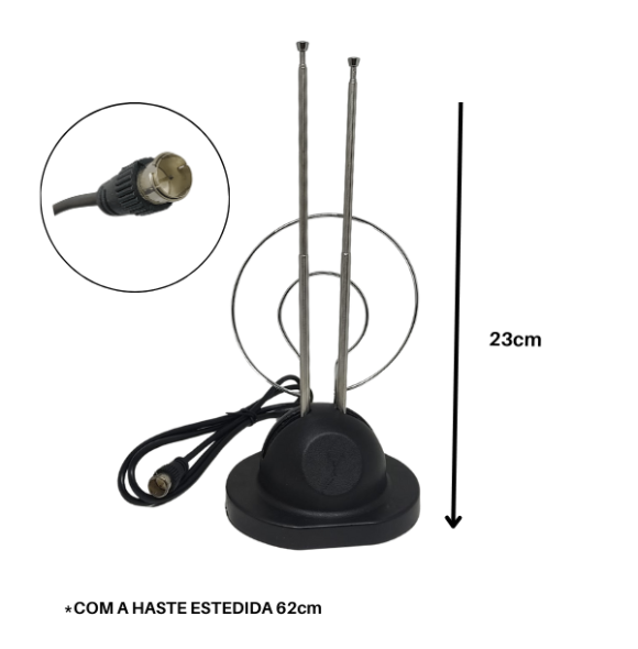Descrição: Antena com faixa de sinal de 80 milhas. Cabo medindo aproximadamente 1,5mt / 4,92 pés. Conector ma cho F, frequencia de trabalho: VHF (172 - 240Mhz) / UHF (470 - 860Mhz). Compatibilidade 720P, 7080i, 1080P, ATSC.